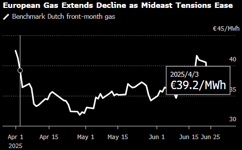 欧洲天然气价格下跌,因以色列与伊朗之间的停火似乎得以维系,缓解了供应担忧,并将关注重点重新转向冬季燃料储备。