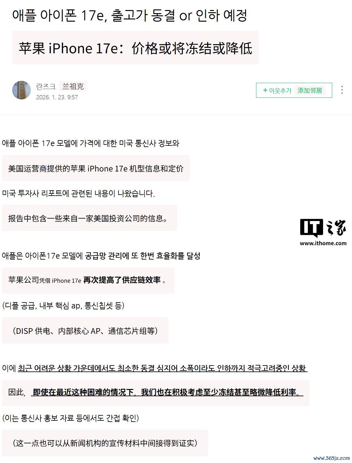 IT之家1月24日消息,消息源yeux1122昨日(1月23日)发布博文灿星财富,爆料称尽管 NAND闪存和 DRAM 内存成本飙升导致高端机型面临涨价压力,但 iPhone 17e 售价不仅有望与 iPhone 16e 持平(国行售价4499元起),甚至可能出现下调。