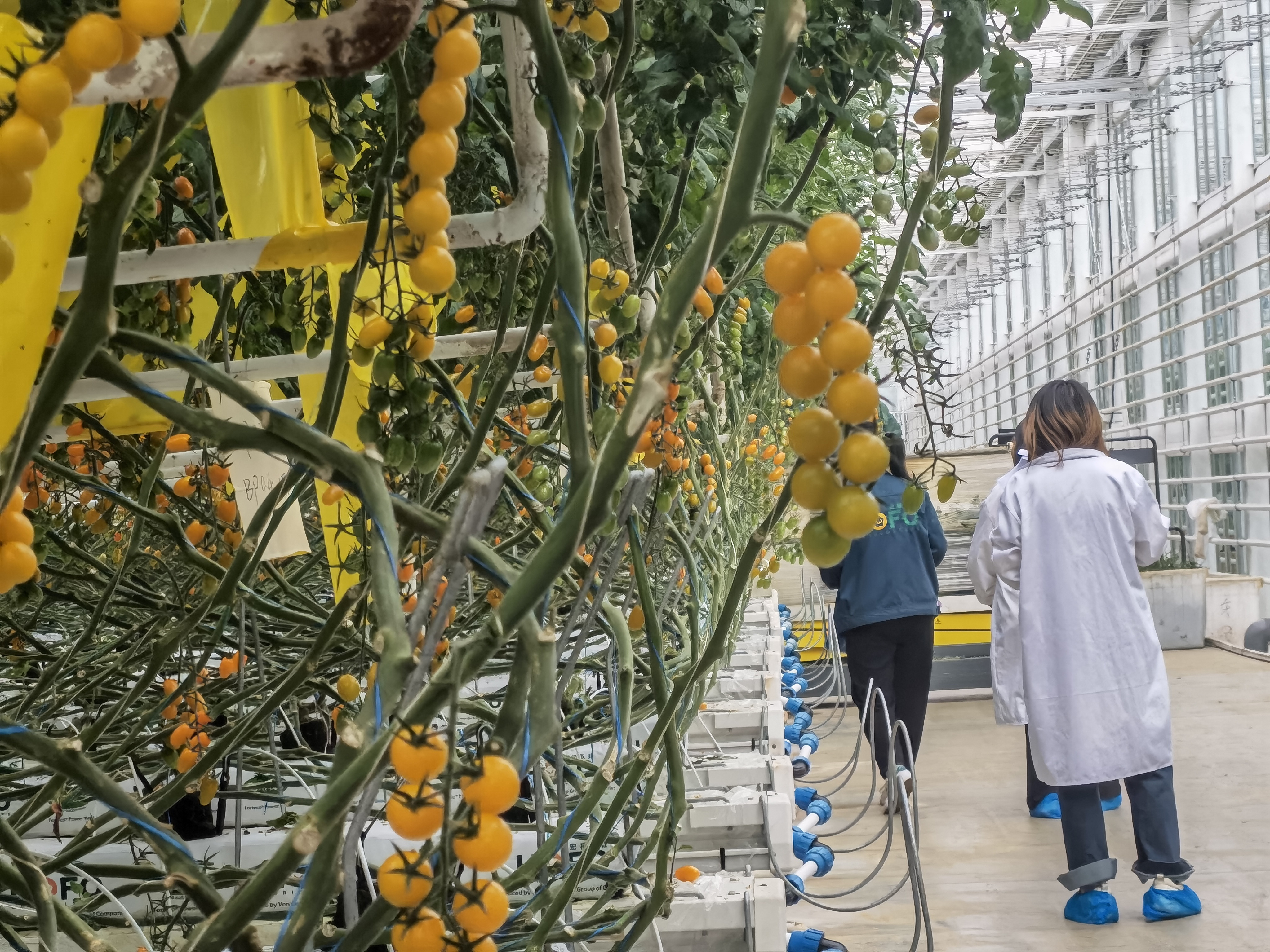 农业产业园区中,工作人员正在准备采收成熟的樱桃番茄。新京报记者周怀宗摄
