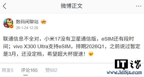 微博博主 @数码闲聊站 对此表示, 17 没有卫星通信版,但后续将提供 eSIM 支持;vivo X300 Ultra 同样支持 eSIM,虽然具体发布日期未定,但确认会在今年第一季度内发布。